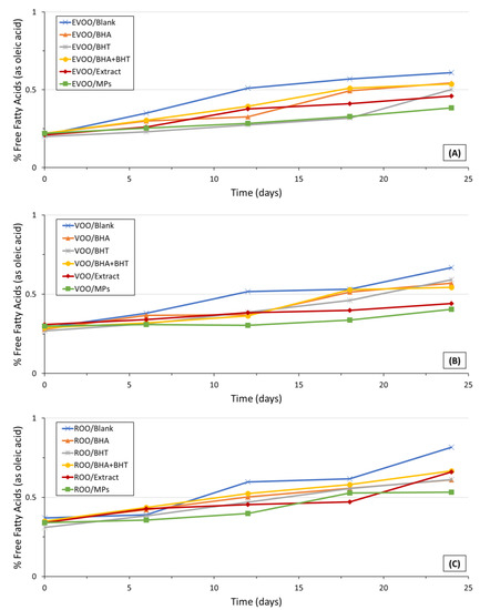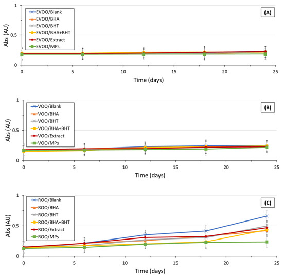 ) extra-virgin olive oil (A), virgin olive oil (B), and a blend of refined and virgin oil (C) during storage. (BHA—Butylated Hydroxyanisole; BHT—Butylated Hydroxytoluene; EVOO—Extra-Virgin Olive Oil; MPs—Microparticles; ROO—blend of refined and virgin olive oils; VOO—Virgin Olive Oil).