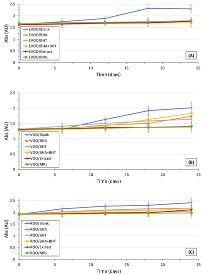 ) extra-virgin olive oil (A), virgin olive oil (B), and a blend of refined and virgin oil (C) during storage. (BHA—Butylated Hydroxyanisole; BHT—Butylated Hydroxytoluene; MPs—Microparticles).