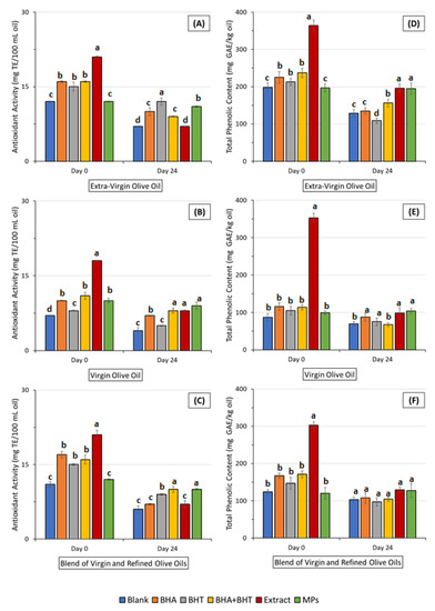 Results of changes in the antioxidant capacity measured by the DPPH of an extra-virgin olive oil (A), a virgin olive oil (B) and a blend of virgin and refined olive oils (C) and total phenolic content of an extra-virgin olive oil (D), a virgin olive oil (E) and a blend of virgin and refined olive oils (F) during storage. (BHA—Butylated Hydroxyanisole; BHT—Butylated Hydroxytoluene; GAE—Gallic Acid Equivalents; MPs—Microparticles; TE—Trolox Equivalents). Means with the same letter, in the same column, did not differ significantly (p ≤ 0.05), according to the Tukey test.