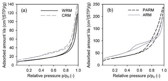 Nitrogen adsorption-desorption isotherms of (a) WRM (washed RM, solid black line) and CRM (calcined RM, grey dashed line) and (b) ARM (HCl-activated RM, solid grey line) and PARM (HCl + H3PO4 -activated RM, black dashed line).
