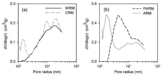 Pore-size distributions of (a) WRM (washed RM, solid black line) and CRM (calcined RM, grey dashed line) and (b) ARM (HCl-activated RM, solid grey line) and PARM (HCl + H3PO4 -activated RM, black dashed line).