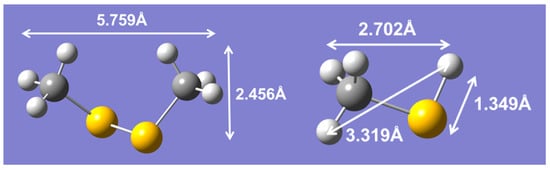 Molecules of dimethyl disulfide, DMDS (left), and methyl mercaptan, MM (right) and their evaluated dimensions.