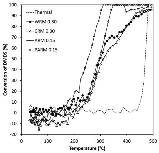 Amounts of RM, the feed concentrations, and weight hourly space velocities (WHSV) in the DMDS experiments (WRM: washed RM, CRM: calcined RM, ARM: HCl-activated RM, PARM: HCl + H3PO4 -activated RM).