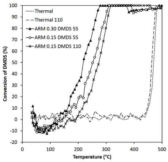 Conversion of DMDS when using different amounts of ARM (HCl-activated RM, 0.30 g or 0.15 g) and different concentrations of DMDS (55 ppm or 110 ppm).