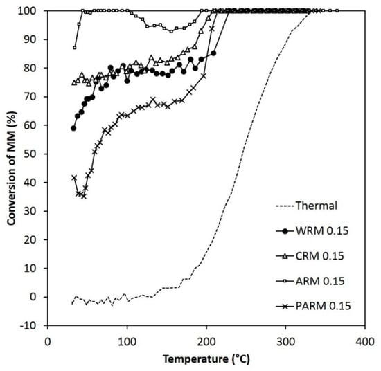 The activity of WRM, CRM, ARM, and PARM in the MM abatement (MM 120 ppm) (WRM: washed RM, CRM: calcined RM, ARM: HCl-activated RM, PARM: HCl + H3PO4 -activated RM).
