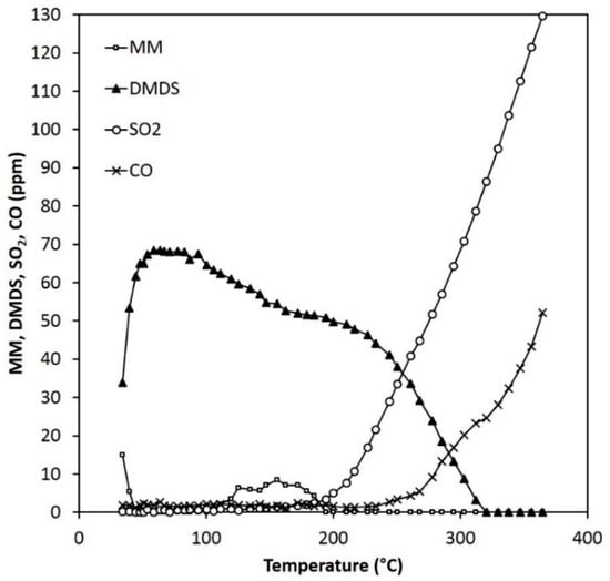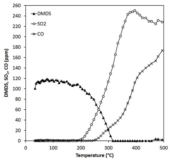 Reactant and product concentrations during the DMDS experiments (110 ppm) over 0.15 g of ARM (HCl-activated RM).