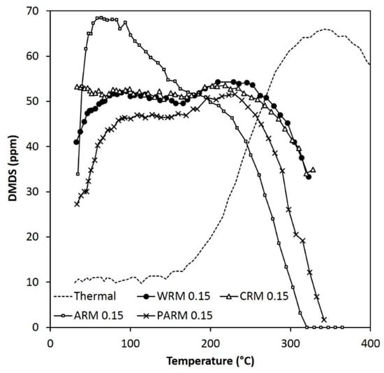 The concentration of DMDS during the MM experiments (MM feed 120 ppm) (WRM: washed RM, CRM: calcined RM, ARM: HCl-activated RM, PARM: HCl + H3PO4 -activated RM).