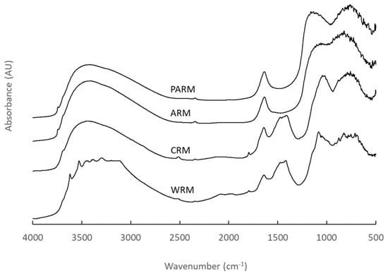 The DRIFT spectra of the fresh RM samples (WRM: washed RM, CRM: calcined RM, ARM: HCl-activated RM, PARM: HCl + H3PO4 -activated RM).