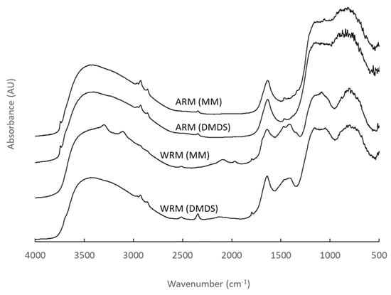 The DRIFT spectra of the used WRM (washed RM) and ARM (HCl-activated RM) samples after DMDS and MM experiments.