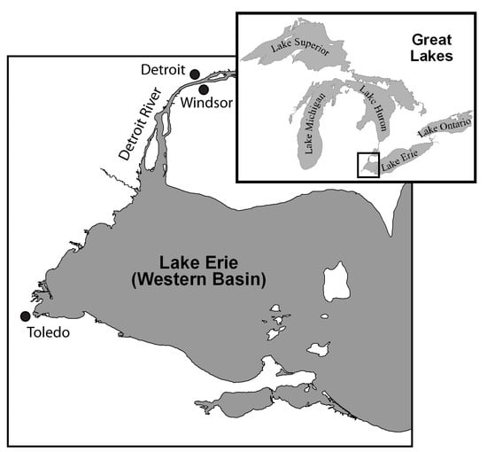 - Wills, T.; Marklevitz, S.; Faust, M. Walleye Population of Lake Erie. In Checkup: Assessing Ecosystem Health of the Detroit River and Western Lake Erie; Hartig, J.H., Francoeur, S.F., Ciborowski, J.J.H., Gannon, J.E., Sanders, C., Galvao-Ferreira, P., Knauss, C.R., Gell, G., Berk, K., Eds.; Great Lakes Institute for Environmental Research Occasional Publication No. 11; University of Windsor: Windsor, ON, Canada, 2020; pp. 327–330. [Google Scholar]