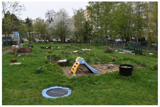 The CG ‘Žížala na Terase’ is located between prefabricated blocks of flats in a densely populated area (see Figure 2). Around 20,000 inhabitants live in this part of the city [39]. The CG was established in 2017 as a bottom-up initiative of local community members on an unused and neglected municipal property that belongs to the area of a public primary school. Of the total CG area of 1300 m2, approximately 200 m2 is made up of growing plots, the rest is designed for community activities and consists of fruit and ornamental trees, shrubs, herbs, open grass areas, a garden house and a fireplace. The CG is used to grow fruit, vegetables and herbs, but equally important is its cultural and educational function in connection with the local school and the surrounding area. The CG is also open to the public, especially for themed events (e.g., yoga lessons).