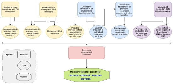Methodologically, this article is based on a combination of several methods that have been successfully applied in research projects dealing with CGs as an adaptation measure to climate change, the motivation of members and coordinators of CGs, crop production of CGs and potential of CGs in times of crisis to eliminate the negative impacts on the population. The data collection started before COVID-19, continued during and after the COVID-19 pandemic and gradually reflected current issues (pandemic restrictions, price increases and related changes in people’s behaviour). An overview of the mixed methods is shown in Figure 3. The information was collected using two semi-structured interviews with the CG coordinator and using a questionnaire survey (QS) among members of the case study CG. Based on the interviews and field surveys, the level of provision of individual ES was identified and assessed qualitatively. Secondary data based on a literature review were collected, for instance, on the average production in Czech CGs and market crop prices, and then used to transfer values to express specific ES in monetary units. The different methods and their implementation are further presented in the following Sections.