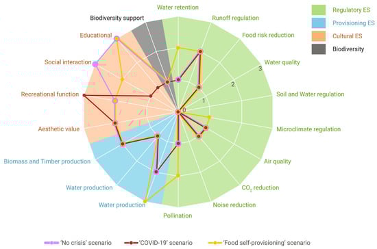 The ‘Žížala na Terase’ CG provides benefits for its members and the wider surrounding area that falls into all ES categories, i.e., ES related to regulation, provisioning, culture and biodiversity support. However, the qualitative level of these ES varies across the scenarios evaluated. Figure 4 shows how ES provision changes depending on the different scenarios, as described in Section 2.2, i.e., ‘No crisis’; ‘COVID-19’; and ‘Food self-provisioning’ scenarios. The level of ES provision is set based on multicriteria decision analysis, described in Section 2.3.3.