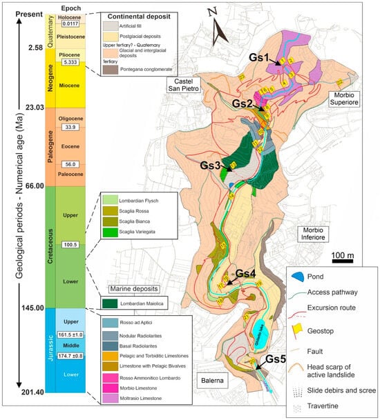 The Parco della Breggia geotrail. Modified after []. Geological time scale is from the International Commission on Stratigraphy (https://stratigraphy.org/chart, accessed on 22 August 2023). Gs 1–5: Geosites 1 to 5.