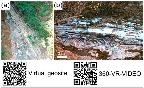 (a) UAV-captured view of the layers of Scaglia Bianca deformed by the fold; (b) detail of steeply-dipping strata of the Scaglia Bianca. The two QR codes enable viewers to access the Virtual Geosite and a 360° video.