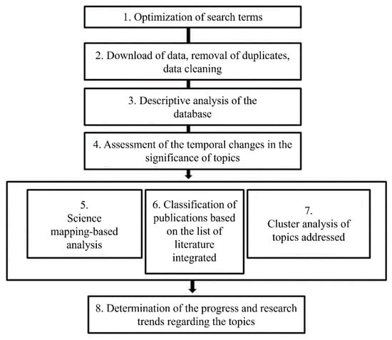 While optimizing search terms, we used several word combinations to shed light on the importance of biological resources in the construction industry. The use of some terms (e.g., green building, green planning, green materials, or green construction) yielded extensively broad and general lists of publications, so after optimizing the various possible search terms, the term combination “green” AND “building materials” OR “biobased building materials” was selected to be used on the scientific materials published between 1975 and April 2023 (1). We downloaded and reviewed the listed literature items (n = 977) one by one, removed duplicates and incorrect references, and searched for documents that could not be extracted from WoS for any reason (2). Subsequently, we conducted a statistical analysis of the data and analyzed, among others, publications with multiple authors, author collaborations, and the yearly number of publications (3). The temporal analysis was also carried out from the perspective of crises concerning the construction industry and biological resources (e.g., paradigm shifts following crisis periods) (4). In addition to manual analysis methods, we applied software analysis. We could name the relevant scientific areas of the studied publications, their order (5), and the most relevant keywords based on titles and abstracts (6). Then, we formed clusters related to each topic area (7), which determined the prevailing progress and trends in the research area (8). For the statistical analyses, CitnetExplorer [], Bibliometrics R-package [], and VOSviewer [] were used.