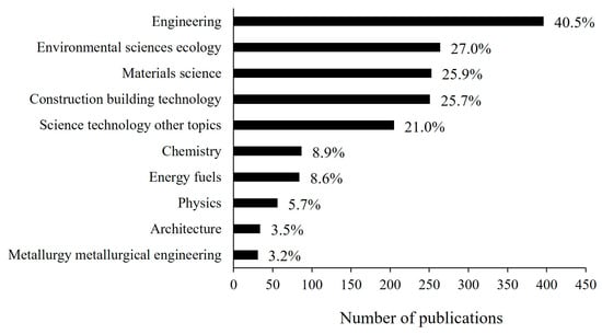 Based on the analysis of the publications after data cleaning, it can be concluded that the following disciplines were linked to the papers the most frequently: engineering, environmental sciences ecology, materials science, construction building technology, and science technology other topics. It suggests that besides the vital role of engineering, several different research areas significantly influence the introduction and spread of sustainable building materials. These results are summarized in Figure 2.