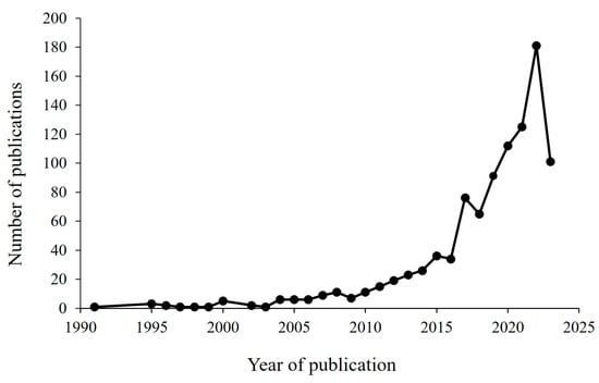 The data of the studied literature show that, with only two minor setbacks, the number of publications has been steadily increasing since 2015 following the adoption of major circular economy policy proposals (Figure 3). The first study addressing the analysis of organic compounds present in weathered building materials of monuments dated back to 1991 []. As the WoS search was conducted on papers published until April 2023, the data for 2023 represent partial yearly results; however, compared to the number of publications (181) in the whole year of 2022, a significant improvement is expected by the end of 2023 based on the number of papers (101) published in the first four months.
