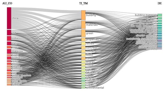 Using the R-program and the Bibliometrix software, we found that the issue of new types of raw materials can be considered an important topic for researchers worldwide. We studied the affiliation countries of the authors, the key terms in the titles of the studies, and the matrix of keywords indicated by the authors. Overall, it can be stated that researchers from China, the USA, India, and Malaysia deal with the issue of green building materials and biobased building materials the most frequently (Figure 5).