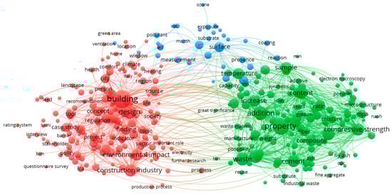 Subsequently, the clusters into which the analyzed studies can be classified were also assessed using VOSviewer. The analyses resulted in three clusters, as shown in Figure 6: the first deals with green building industry issues (red color); the second includes research on property management, cement research, and waste reduction (green color); and the third cluster deals with various aspects of environmental impact (blue color). As can be seen, there is also strong interconnectivity primarily within and secondary among the presented clusters.