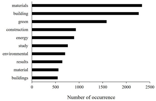If the abstracts of studies on green building materials are considered, the number of sections containing the keywords materials, building, and green is outstanding compared to other topics (Figure 7).