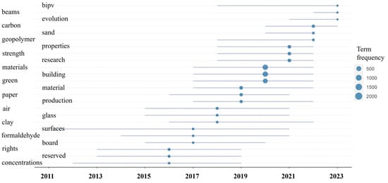 The presence of 24 terms was assessed based on their yearly distribution to analyze abstract content more in-depth. Figure 8 confirmed that the most frequent were materials, building, and green covering six years, with the highest number of occurrences in 2020.