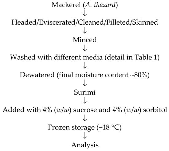 Surimi is one of the fishery products that is intensively manufactured in Asian countries for further processing []. Surimi is a refined sort of fish flesh with special techno-functionalities, such as the capacity to generate gels and bind water and oils, making it an important ingredient in a wide range of processed foods [,]. Surimi processing technology includes washing minced fish to clean and concentrate the myofibrillar proteins, which are then transformed into additional commodities or stabilized by the incorporation of cryoprotectants, frozen, and kept for use afterward []. Optimizing the techno-functionality and quality of surimi generated from raw materials, which are typically underused, low-value fish species, is a general objective of surimi research studies and production operations [,,]. Surimi may possibly be made from any fish, but the gelling features of the surimi are determined by the nature of myofibrillar proteins, which are impacted by the species and freshness of the fish, in addition to the processing conditions, primarily in terms of protein concentration, ionic strength, pH, and temperature []. Threadfin bream (Nemipterus spp.), bigeye snapper (Priacanthus spp.), croaker (Pennahia and Johnius spp.), and lizardfish (Saurida spp.) are the principal white fish employed in Southeast Asia for the manufacturing of surimi []. The supply of raw materials, however, is the fundamental issue facing the Asian surimi industry []. Dark muscle fish have garnered more interest as a potential replacement raw material for the manufacture of surimi owing to the restricted white muscle fish supplies and the excessive harvesting of white fish in Thailand []. According to reports, the Gulf of Thailand has seen a rise in the catch of pelagic fish [,]. As a result, one of the most difficult ways to convert fish resources into human consumables, especially protein-gated products, is the usage of this small pelagic fish for the manufacturing of surimi. Chaijan et al. [] examined the gel-forming capacities of surimi from the dark-fleshed mackerel species Restrelligar kanagurta, Restrelligar brachysoma, and Auxis thazard.