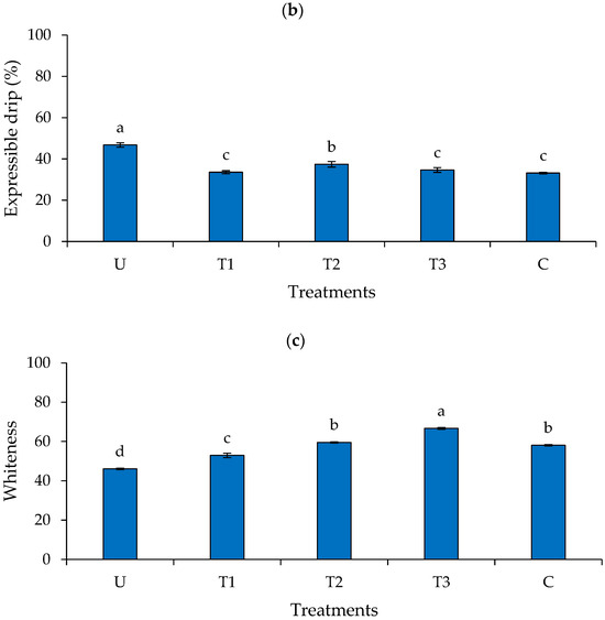 Effect of cold carbonated water and NaCl washing on gel strength (a), expressible drip (b), and whiteness (c) of mackerel surimi gel in comparison with gels from unwashed mince and conventional surimi. Bars indicate standard deviation from 3 determinations. Different letters on the bars represent significant differences (p < 0.05). U = unwashed minced. T1 = cold carbonated water washing in the 1st washing cycle and cold tap water washing in the 2nd and 3rd cycles. T2 = cold carbonated water washing in the presence of 0.3% NaCl (w/v) in the 1st washing cycle and cold tap water washing in the 2nd and 3rd cycles. T3 = cold carbonated water washing in the presence of 0.6% NaCl (w/v) in the 1st washing cycle and cold tap water washing in the 2nd and 3rd cycles. C = conventional washing with 3 cycles of cold tap water.