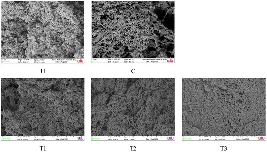 Microstructure of gels from unwashed mince and surimi from mackerel surimi. (Magnification: 10,000× EHT: 5.0 kV). U = unwashed minced. T1 = cold carbonated water washing in the 1st washing cycle and cold tap water washing in the 2nd and 3rd cycles. T2 = cold carbonated water washing in the presence of 0.3% NaCl (w/v) in the 1st washing cycle and cold tap water washing in the 2nd and 3rd cycles. T3 = cold carbonated water washing in the presence of 0.6% NaCl (w/v) in the 1st washing cycle and cold tap water washing in the 2nd and 3rd cycles. C = conventional washing with 3 cycles of cold tap water.