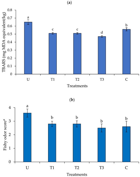 Surimi gel had a higher level of whiteness than unwashed mince, and among the surimi, the gel from T3 had the highest whiteness. Surimi’s color was influenced by its residual pigment content and thermal gelation stability. Furthermore, components like lipids, which can oxidize when heated, can serve as an additional source of color via the Maillard reaction because lipid oxidation produces aldehyde, which can then combine with amine to create brown pigment via the amine–carbonyl reaction or Maillard reaction [,]. T3′s gel was the whitest because it had the least amount of myoglobin, non-heme iron, and lipid (Figure 2), as well as the lowest degree of lipid oxidation (see below).