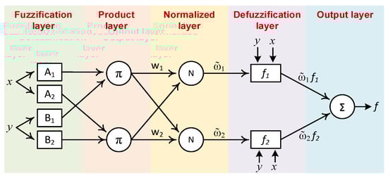 where, the As and Bs are the membership functions of the two inputs x and y, respectively. However, the final output f is calculated based on the two rules’ outputs, f1 and f2, as follows: