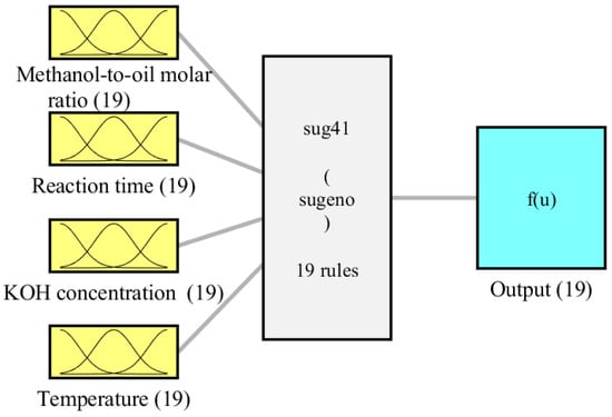 Biofuels offer a viable path towards a low-carbon energy future [,]. As a result, biofuel generation, particularly from waste oil, is being extensively explored and developed as a technique for reducing the effects of fossil fuels, contributing to the circular economy, and boosting energy security [,]. However, the productivity of biofuel production is a complex process that is influenced by a variety of factors such as feedstock type, manufacturing procedures, and operational circumstances [,]. These criteria must be optimised to ensure that biofuel production is not only ecologically beneficial but also economically viable. This is where the potential of AI (artificial intelligence) comes into play. AI, particularly modelling and optimisation, can be used to significantly increase the efficiency of biofuel production. These strategies aid in making optimal judgements about biofuel-production operating conditions, resulting in increased efficiency and maximizing the output. AI accomplishes this by analysing intricate correlations between various variables, accurately predicting outcomes, and making suggestions based on these predictions [,,]. Fuzzy modelling, in particular, provides a flexible and effective method for modelling the inherent uncertainty and non-linearity in biofuel production processes. Meanwhile, AI optimisation algorithms can discover the most effective operating conditions for biofuel synthesis from waste oil, lowering the number of required tests and enhancing overall process efficiency [,].