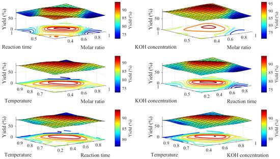 Figure 5 depicts the system’s input–output relationship while evaluating two inputs at the same time using a 3D point-of-view spatial representation and contours. The highest output values are indicated in dark red, while the lowest values are depicted in dark blue. The figure clearly shows that the optimal biodiesel yield was obtained when each binary variable (methanol-to-oil ratio, reaction time, reaction temperature, and KOH concentration) reached its optimal value. Increasing the reaction time from 30 min to 90 min increased biodiesel production. However, it is worth mentioning that a longer reaction time has a negative impact on biodiesel synthesis, owing to the hydrolysis of methyl ester that occurs at longer reaction durations []. Also, an optimum methanol to oil molar ratio of 7.5 to 1 is the best for methyl ester production, i.e., biodiesel production, as there is a shortage of methanol or oil at lower or higher ratios. It was also clear that increasing the KOH concentration from 0.6 wt% to 1.1 wt% resulted in an increase in biodiesel production; however, a higher KOH concentration of 1.6 wt% decreased the biodiesel production. The presence of the KOH enhanced the reaction between methanol and oil for the esterification process; however, at higher KOH concentrations, soap is produced due to the reaction between the potassium and the triglycerides, thus decreasing biodiesel production.