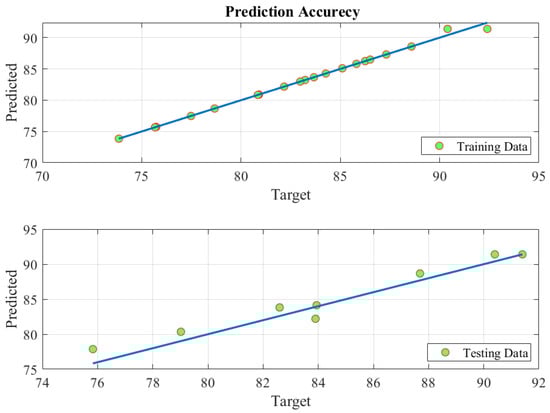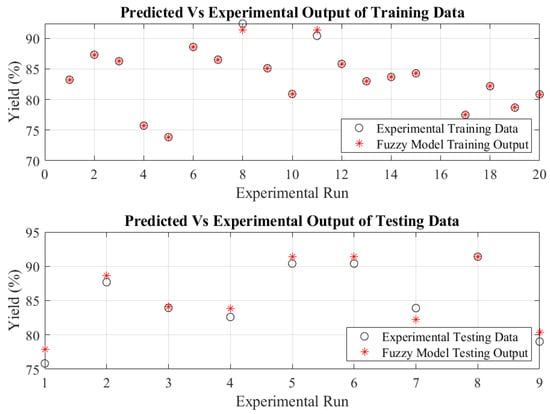 Capturing the correct relationship between the inputs and outputs of the biodiesel-manufacturing-process system enables the built fuzzy model to perfectly anticipate performance. This is evident from the plot of the fuzzy model’s anticipated outputs against the experimental data in Figure 6. Clearly, there is an excellent fit between the estimated and measured data. In addition, for both the training and testing stages, the predictions’ plots around the 100% precision line are shown in Figure 7.