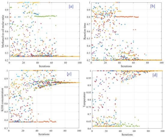 Particles convergence during the optimisation process. (a) Normalised methanol-to-oil molar ratio, (b) normalised reaction time, (c) normalised KOH concentration, and (d) normalised temperature.
