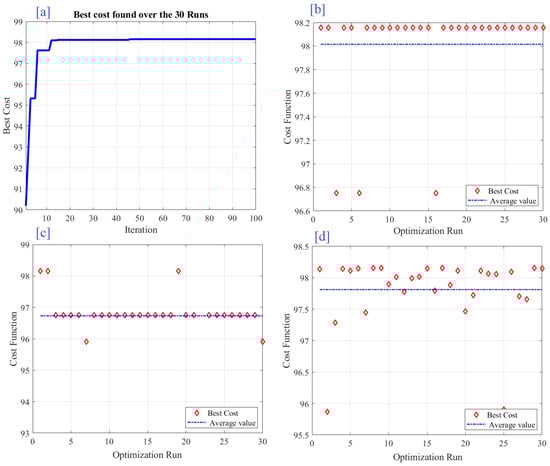 Results of 30 Runs. (a) Best cost function found over 30 runs of BAS, (b) BAS, (c) PSO, and (d) SCA.
