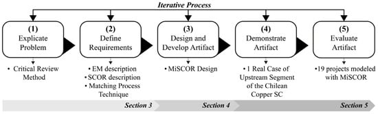 This study follows the methodological framework for DSR by Johannesson and Perjons [23], which considers five research steps: (1) Explain the problem; it was described the requirements and specificities of the upstream segment of the MiSC and the absence of standardization in the business process modelling in this segment through a critical review method [25] (cf. Section 3.1). (2) Define the requirements; it was defined the reference models, SCOR and EM, used in this study. Moreover, an analysis was performed on the feasibility of integrating both reference models and the requirements for their adaptation based on the Matching Process Technique by Beheshti et al. [26] (cf. Section 3.2). (3) Design and develop the artifact; it was designed the MiSCOR following a top-down expansion technique [27,28] (cf. Section 4). (4) Demonstrate the artifact; MiSCOR was applied in a real case of the upstream segment of the copper supply chain in Chile. (5) Evaluate the artifact; MiSCOR was evaluated using 19 operational scenarios of the real case upstream segment of the copper supply chain in Chile carried out from 1995 until 2020 (cf. Section 5). Figure 1 represents the roadmap of the DSR methodology in this study.
