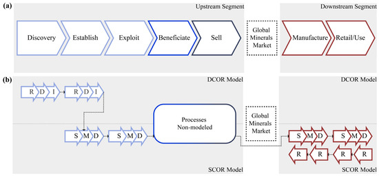 On the other hand, regarding the standardization of the upstream segment of the MiSC, Osborne et al. [39,40] proposed to model the upstream segment of the coal supply chain using the SCOR. The authors justified using the SCOR model due to its wide use in the downstream segment and its capacity to integrate both segments. Likewise, Zúñiga [43] and Zúñiga et al. [42] modelled the business processes of the upstream segment of the MiSC. In this study, the author adapted the processes of the EM, namely, “Discover”, “Establish”, and “Exploit”, within the logic of the SCOR and DCOR model [52]. However, although these studies attempted to standardize, clarify, and better understand the upstream segment of the MiSC, they have not addressed its full extent. Therefore, modelling the upstream business processes (the material flow to the downstream segment, namely, Beneficiate and Sell) and integrating both segments is still pending. Figure 2b shows the gap in modelling the mineral supply chain using SCOR and DCOR (SCOR family models) as standardized tools in the upstream segment.
