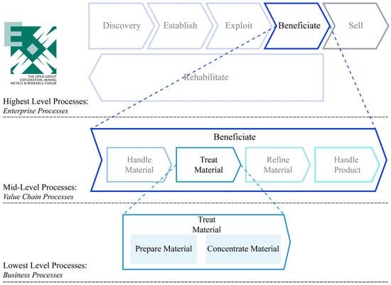 The EM breakdown based on EMMM Forum [22]. The highest level processes represent core Enterprise processes. The mid-level processes show the “Beneficiate” Value Chain process breakdown. The lowest level processes depict the “treat material” Business processes breakdown.