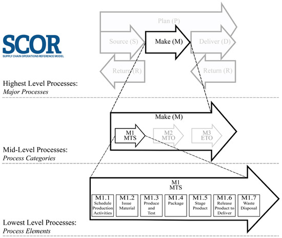 The SCOR breakdown based on APICS [21]. The highest level processes represent the major processes. The mid-level processes show a major process breakdown of the “Make process”. The lowest level processes represent the “MTS” (Make-to-Stock) process elements.