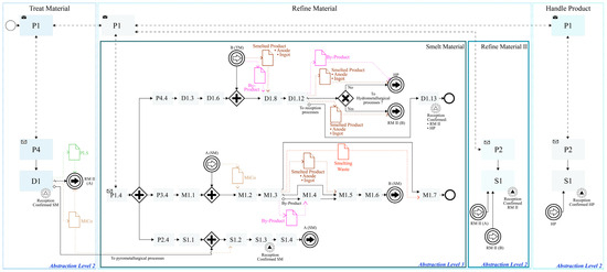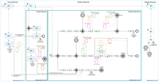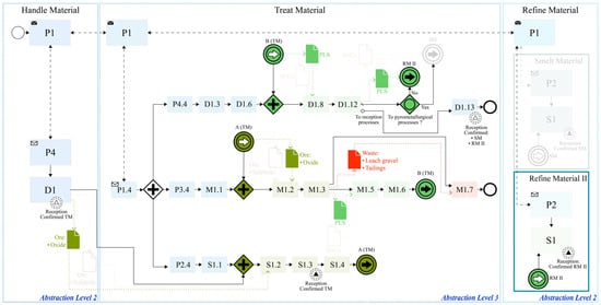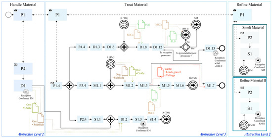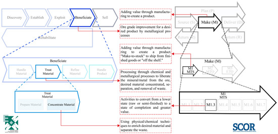 As mentioned in Section Problem and Requirement (cf. Section 3), the “Make” of the SCOR logic is the EM’s “Beneficiate”, which involves four Value Chain processes: (i) “Handle Material”: a collection of all material required for processing; (ii) “Treat Material”: liberating the mineral/metal from the ore through physical, chemical, and metallurgical processes; (iii) “Refine Material”: treating material to generate a more purified product for sale; (iv) “Handle Product”: sorting, blending, packaging, and storage of the marketable materials. From the SCOR perspective, “Handle Material” is understood as the “Source” (S), which focuses on the ordering, delivery, receipt, and transfer of elements of raw materials, subassemblies, products, and services to a manufacturing or delivery stage; “Treat Material” and “Refine Material” are comprehended within the parameters of the “Make” (M) since they both add value to a deliverable product through manufacturing. Both processes add value to ore, and their products are potentially sellable, so they should be considered separately; “Handle Product” is considered as “Deliver” (D) since its purpose is to perform order management and fulfilment activities for the customer. Figure 7 represents understanding the “Beneficiate” Highest Level Process (Abstraction Level 1) in SCOR modelling.