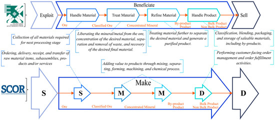 The “Beneficiate” establishes ore treatment to obtain a mineral commodity for the metals market. This definition is similar to the “Make” of the SCOR, which is the process that adds value to a product by manufacturing or creating a product or deliverable. According to [43], the “Exploit” supplies the raw material, ore, to the “Beneficiate” process. The “Exploit” matches with the “Source” of the SCOR, which is responsible for ordering, delivering, receiving, and transferring the raw material. Once the ore is processed into a mineral commodity or mineral, the “Sell” process is responsible for trading and disposing of the mineral product to direct customers or to mineral and metal markets. The “Sell” overlaps with the “Deliver” process of the SCOR, as both manage customer orders.
