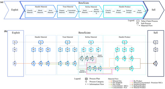 MiSCOR Abstraction Level 2. Modelling of the Value Chain processes of the EM’s “Beneficiate” Enterprise process (a) into SCOR (b), Mid-Level Processes—Abstraction Level 2.