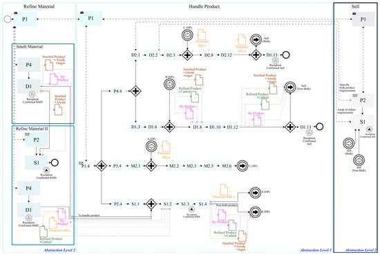 MiSCOR—“Refine Material—Refine Material II”. Modelling of the EM’s “Refine Material II” Business process into SCOR. “Smelt Material” and “Treat Material” on the left are modelled at abstraction level 2. “Refine Material II” in the middle is modelled at abstraction level 3. “Handle Product” on the right is modelled at abstraction level 2.
