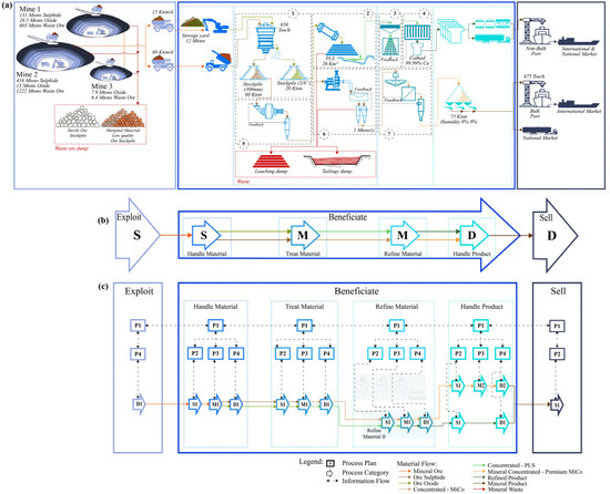 The MiSCOR demonstration was carried out on real case projects at one of the world’s largest copper producers of the last decade. The mining company under study, MP1, has its mining district in northern Chile (Chile is the world’s leading copper producer. In 2021, Chile produced 5.6 million tons of copper, equivalent to approximately one-third of world production [62]). MP1 produces copper concentrate, copper cathode, and the by-product molybdenum. In 1998, MP1 started its commercial operations, registering a fine copper production of nearly 50 kMT (thousands of metric tons) [63]. As of June 2022, MP1’s production levels reached more than 600 kMT [62], representing roughly 4% of world copper production. The MP1 Enterprise processes include “Discovery”, “Establish”, “Exploit”, “Beneficiate”, and “Sell”, demonstrating a vertical integration of the whole MiSC’s upstream segment. For the MiSCOR demonstration, we traced 19 operational projects (cf. Appendix A) developed by MP1 since 1995. The traced projects comply with the framework of the Chilean Environmental Impact Assessment System [64]. These projects describe the “Exploit” and “Beneficiate” Enterprise processes in detail. All projects were modelled into all levels of abstraction with MiSCOR. For illustrative purposes, the “Beneficiate” of the “MP1 kickoff project” of 1995 is described and graphically modelled (Figure 14a) and modelled into MiSCOR at abstraction levels 1 (Figure 14b) and 2 (Figure 14c). In addition, MiSCOR abstraction level 3 is modelled from the oxide ore perspective processing of the “Treat Material” of the “MP1 kickoff project” (Figure 15).