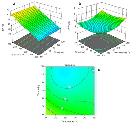 RSM plots and desirability contours: (a) For MY: Temperature–Time, with B/W ratio = 0.0375; (b) For qe: Temperature–Time, with B/W ratio = 0.0375; (c) For desirability: Temperature–Time, with B/W ratio = 0.05.