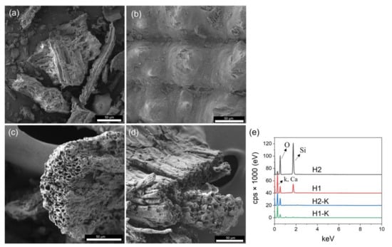 SEM images of (a) H1, (b) H2, (c) H1-K, (d) H2-K; (e) EDS spectra of materials.