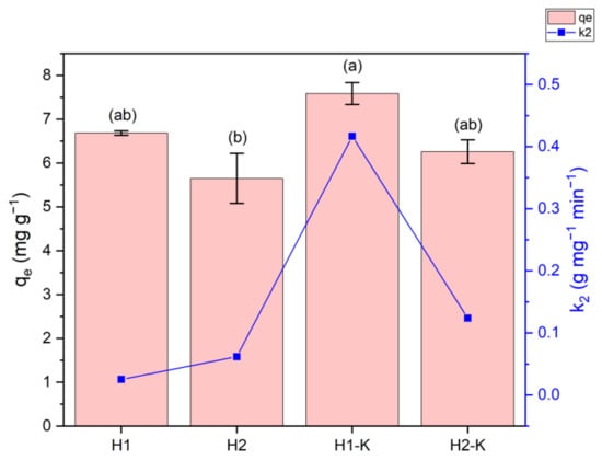 Moreover, alkali activation was also tested in H1 and H2 hydrochars to identify further improvements in the adsorption capacity. In this sense, even though no statistical differences were observed for qe values, a remarkable enhancement was found for the second-order kinetic constant, especially in the H1-K adsorbent, which means the adsorption time can be significantly reduced in this case, probably due to the larger surface area measured in this activated hydrochar.
