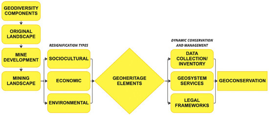 Furthermore, Brazil, and specifically MG, has great potential in terms of geodiversity, with studies showing the country among the top five in scientific contributions related to the variety of elements and values of abiotic nature [12]. In the last two decades, approaches related to nature conservation, territorial planning, and sustainable development have been gaining a new look with the term geodiversity [13,14,15]. According to Gray [16], geodiversity is creating a multifaceted and evolving concept, comprehending the wide range of geoscientific paradigms or the ‘Gs’ (i.e., geology, pedology, geomorphology, geosystem services, geoheritage, and geotourism). Rooted in the ‘Gs’ framework [17], we structured a possible geoconservation framework for mining landscapes (Figure 1), progressing from geodiversity components, which include their assemblages, structures, systems, and contributions to landscapes, to how mine development has been shaping landscapes, thus creating the mining landscape. This “recently molded place” was the subject of an intensive mining process, upbringing new values and meanings, giving new attention to different aspects of the sociocultural, economic, and environmental contexts, and emphasizing the capital value attributed to mineral resources [18]. This area, under the operations of a company or enterprise, is now a complex engineering work that not only comprises sources of industrial activities (i.e., infrastructure, facilities, machinery, and open pits) but also many elements of earth’s abiotic nature that have considerable scientific, sociocultural, historical, and/or aesthetic values, the so-called geoheritage. Moreover, the exceptional values attributed to geoheritage elements are usually protected under several forms of instrumentalities and laws. Therefore, an alternative, systematic approach is needed for reconciling conservation activities, territorial planning, and sustainable development. Within the geoconservation framework, three types of efforts emerge as crucial elements: (i) systematic inventory of geodiversity and geoheritage, (ii) use of the geosystem services approach for interpreting the role of abiotic nature within ecosystems, and (iii) the development of strong legal frameworks for environmental protection. The first effort is related to data collection and analysis methods that consider the elaboration of specific geological categories to determine places of interest (i.e., geosites) and produce qualitative and quantitative assessments and indicators. The second one is the goods and services related to geodiversity, which is equivalent to the ecosystem services framework [16]. Finally, the third one relates to legal measures, statutory protection, environmental laws, and conservation and management strategies designed based on geoheritage planning. Combined, the three efforts promote the maintenance of geoconservation, a ground for the creation of UNESCO Global Geoparks (UGGp) and subsequently, the GEOfood brand.