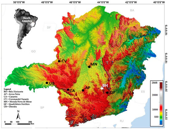 Among the five largest states in Brazil, Minas Gerais is in the southeastern region of the country with an area of 586,528 square kilometers, with Archean to Phanerozoic age sequences occurring in the most varied tectonic and metamorphic context. An eroded plateau comprises most of the region, with several mountain chains surrounding the state, including peaks that can reach approximately 2800 m a.s.l., which differs from other regions of the country due to the diversity of the morphological conditions present [44] (see Supplementary Material S1 for a complete geodiversity map of the state).